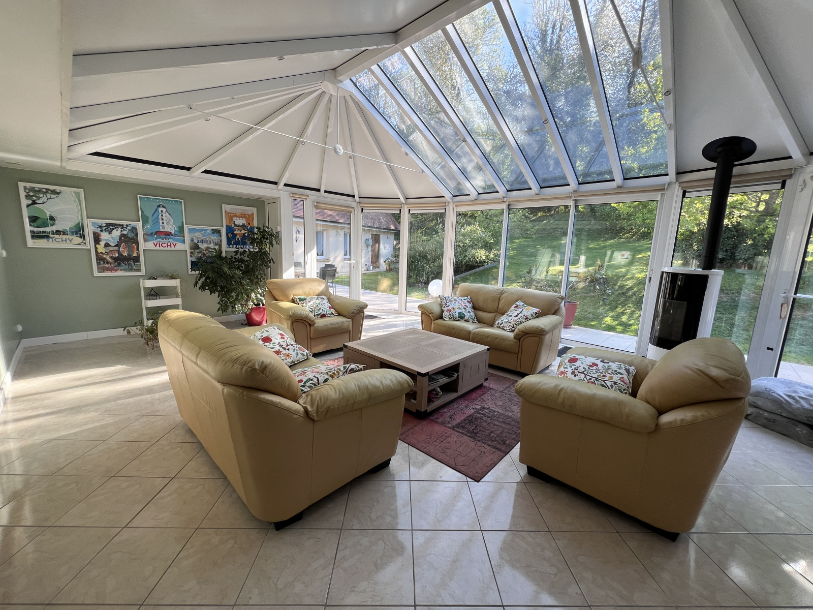 Dans son prolongement la véranda d'environ 40 m² apporte une véritable pièce de vie supplémentaire, lumineuse et confortable, équipée elle aussi d’un poêle à granulés.